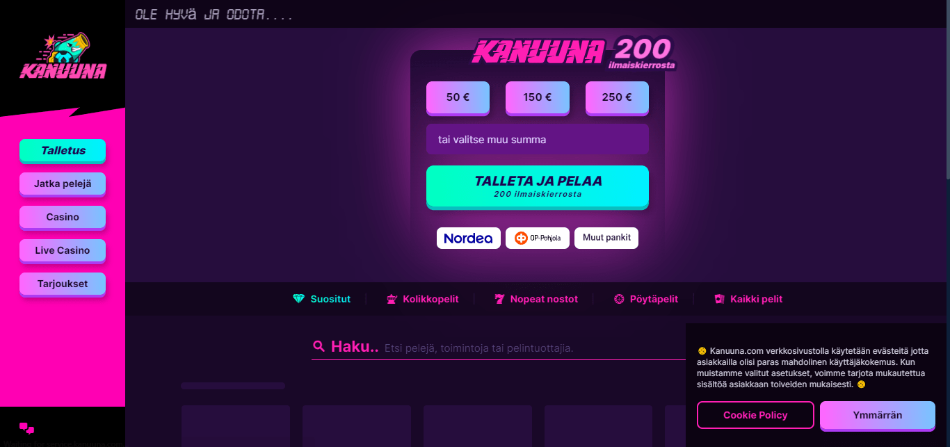 Kanuuna Casino on online-kasino, jossa pelaajien ei tarvitse rekisteröidä pelitiliä pelatakseen. Pelaajat voivat yksinkertaisesti tallettaa ja pelata päästäkseen suosikkipeleihinsä nopeammin. Kasinolla on valikoima suosittuja kasinopelejä ohjelmistotoimittajilta, joihin kuuluvat NetEnt, Microgaming, Pragmatic Play ja Relax Gaming. Sivustoa voi käyttää useimpien verkko- ja mobiiliselaimien kautta ja se on saatavilla suomeksi ja viroksi. Kasino on myös Viron vero- ja tullihallituksen lisensoima ja sääntelemä.