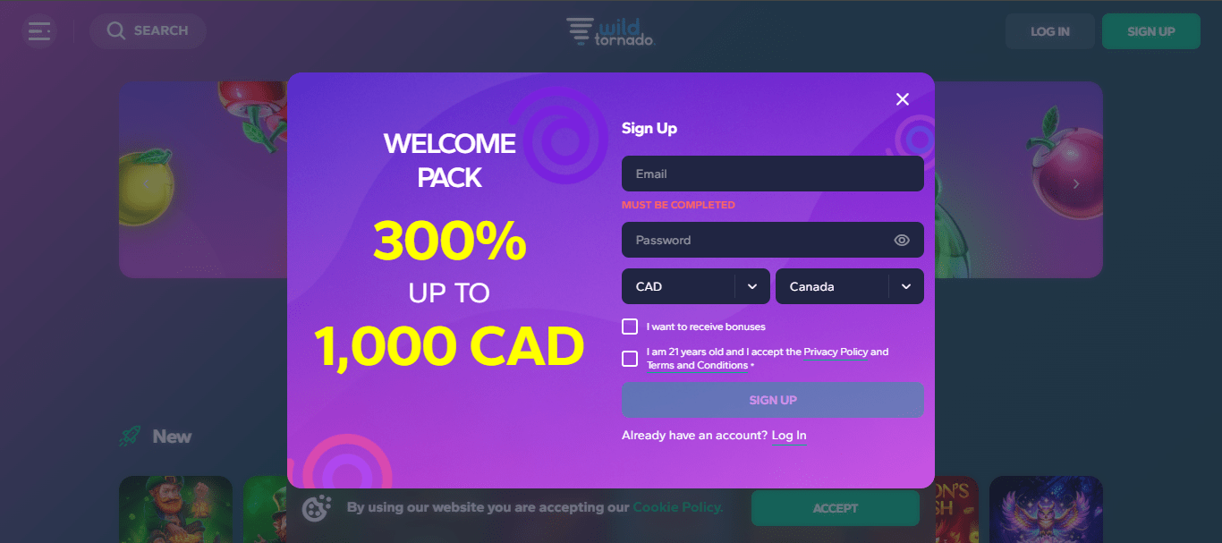 Over 3000 games can be found in the vast library of Wild Tornado. These consist of different game shows and video slots, poker, blackjack, baccarat, roulette, sic bo, and dragon tiger. Additionally, a live casino featuring over 190 dealers is available. All of this is supported by over 40 game providers, including Play'n GO, Evolution, Microgaming, Yggdrasil, NetEnt, Booming Games, Blueprint, Playson, and multiple others.